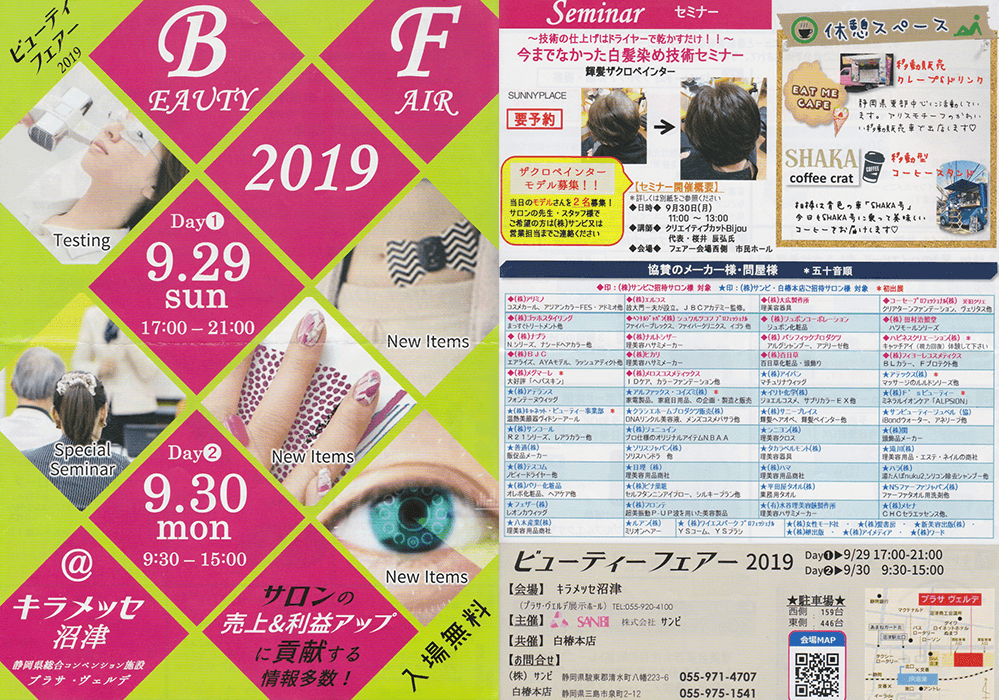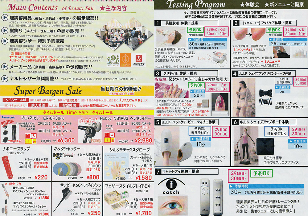 毎年恒例の「BEAUTY FAIR・ビューティーフェア」当日限りの超特価商品やサロンの売上アップに貢献する情報多数!!話題の白髪染め「ザクロペインター」技術講習会開催!お誘い合わせの上、是非ご来場ください。